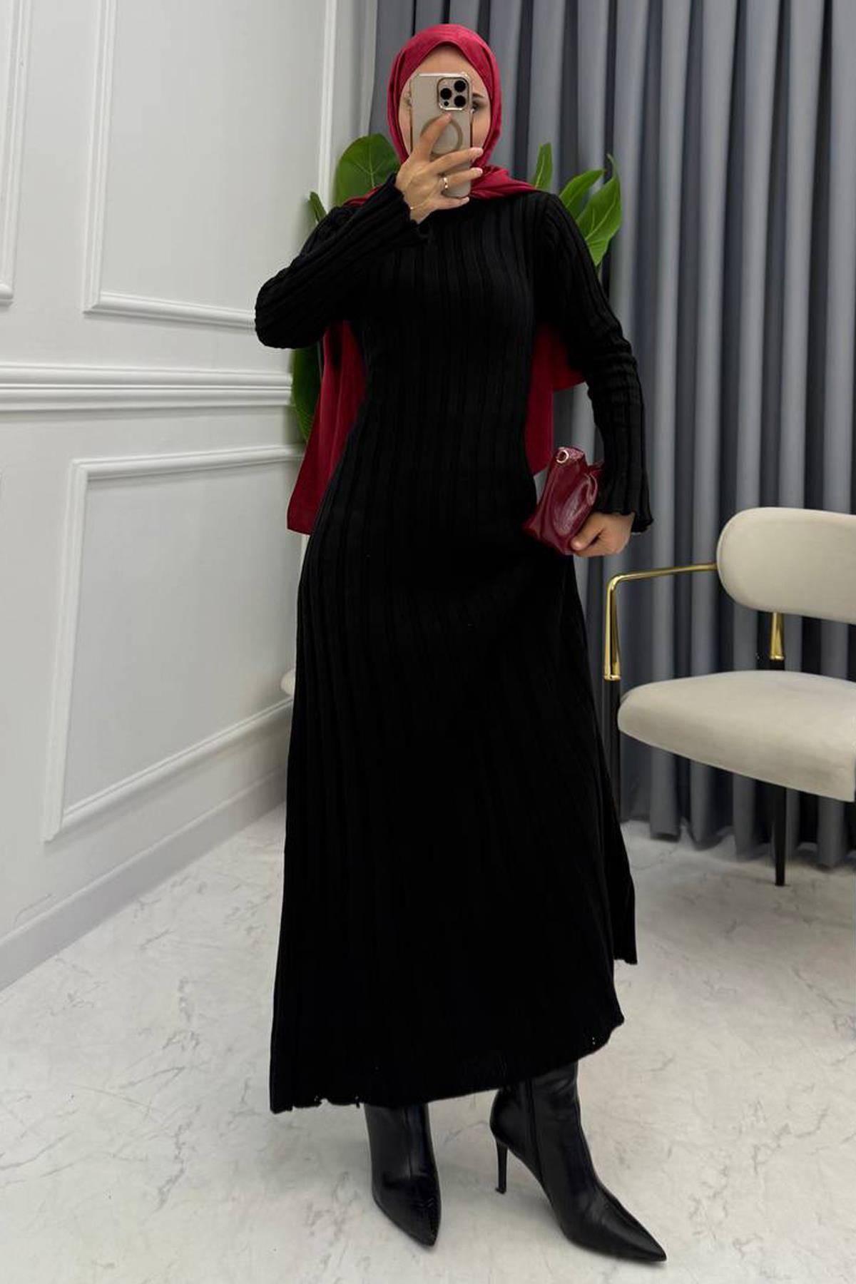 BELİ BAĞLAMALI TRİKO ELBİSE SİYAH (203464)