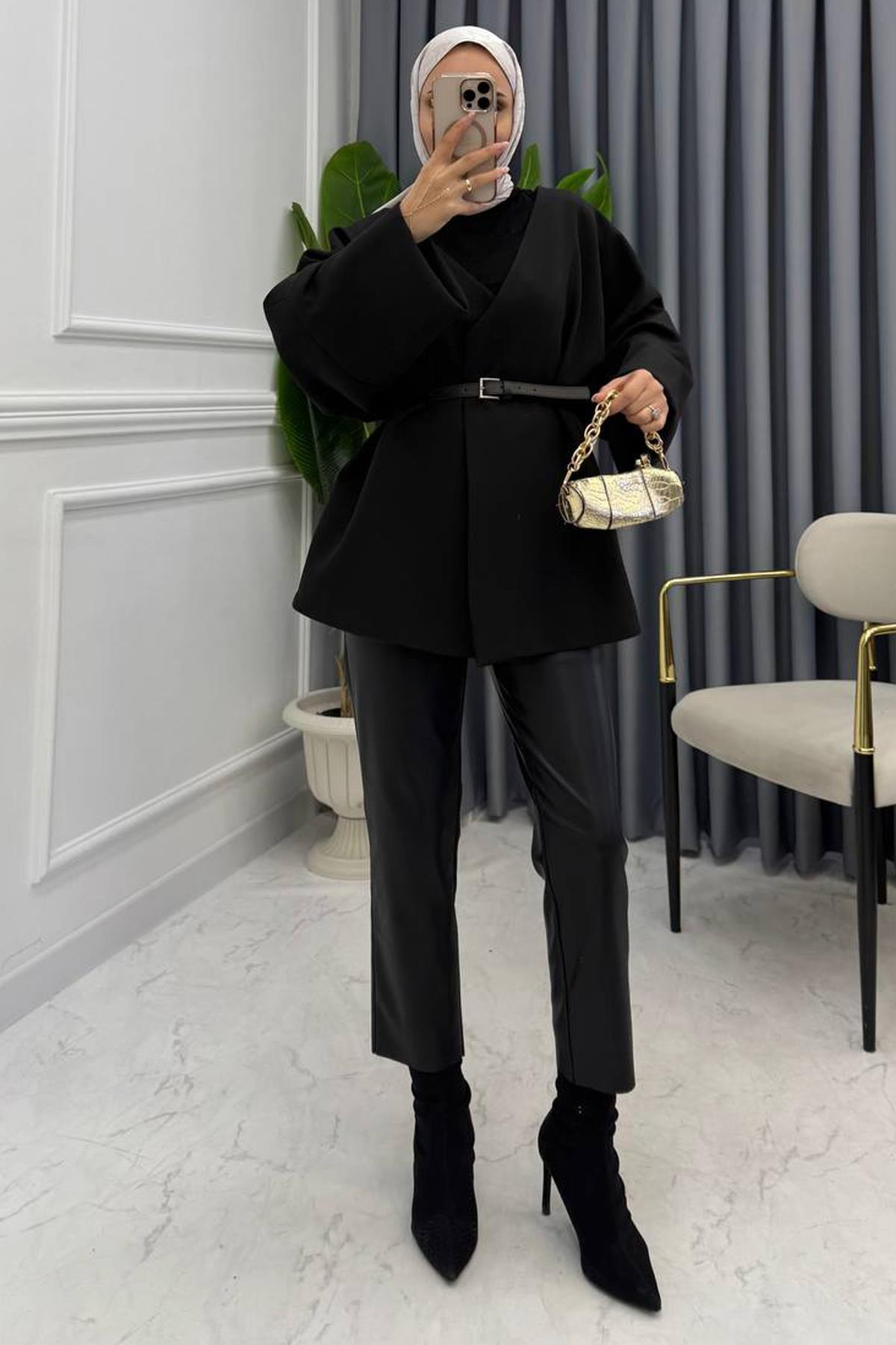DERİ KEMER DETAYLI CEKET SİYAH (203382)