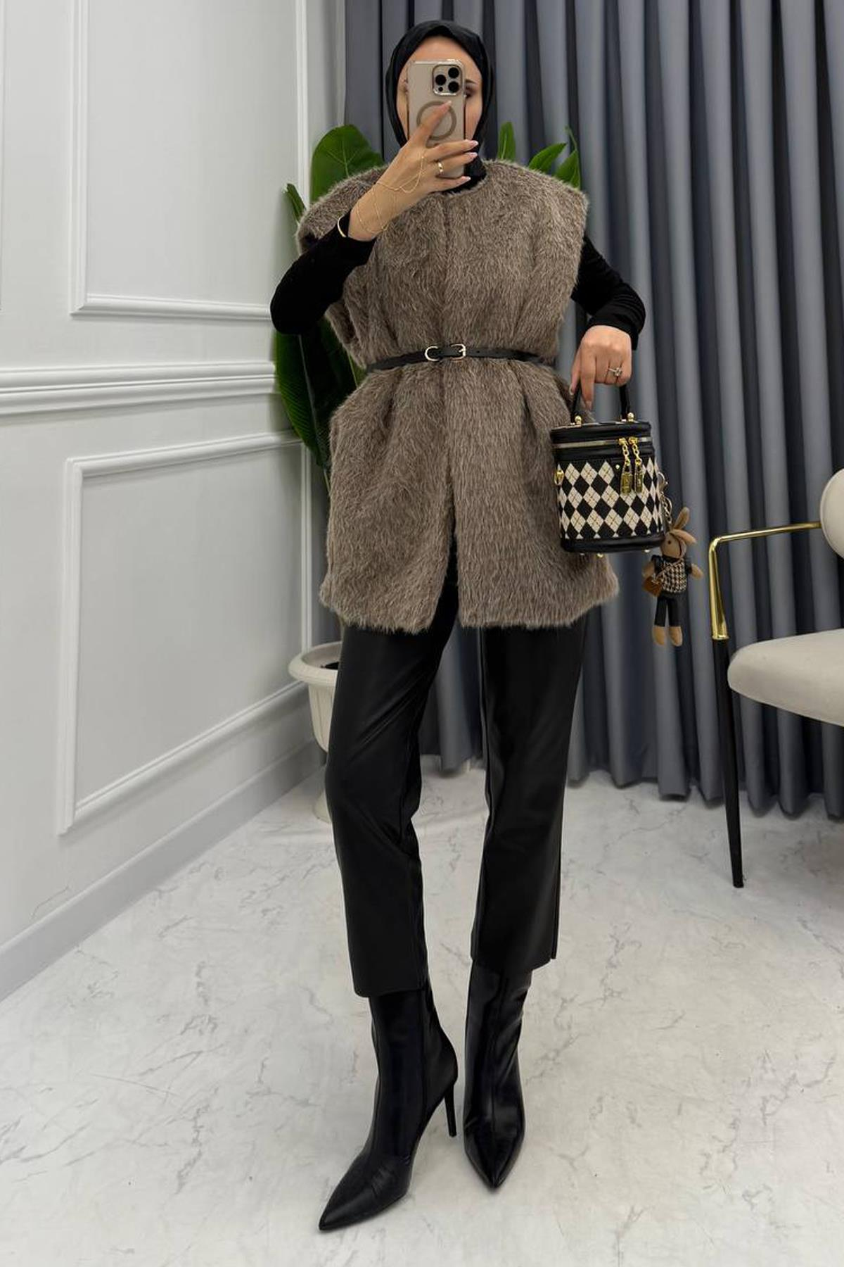 DERİ KEMERLİ KÜRK YELEK KAHVE (203437)