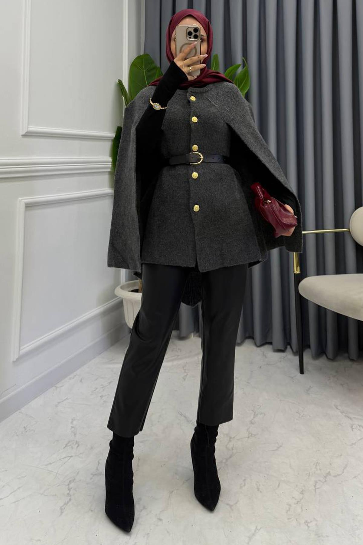 DERİ KEMERLİ TRİKO PANÇO GRİ (203445)