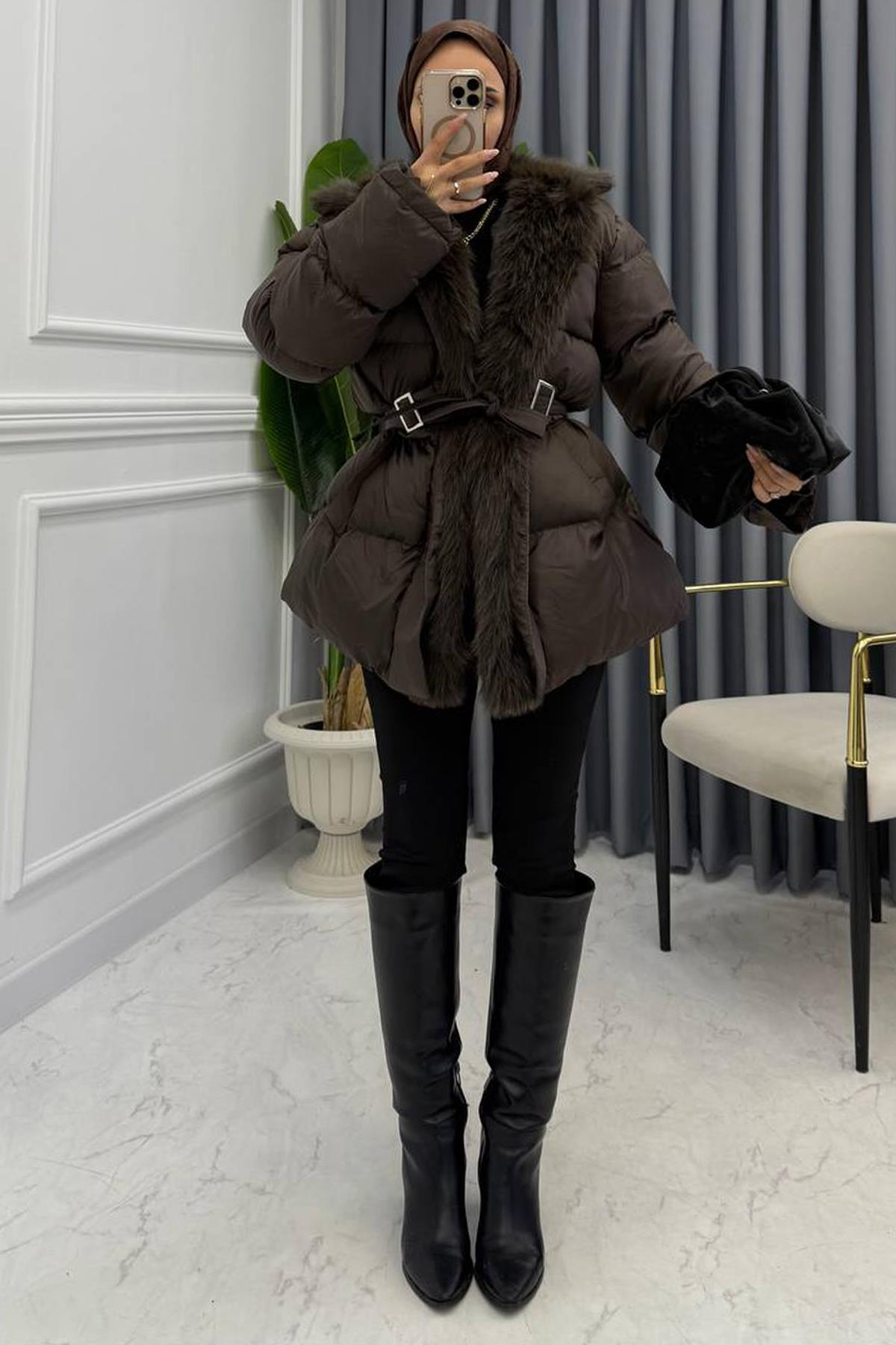 KÜRK DETAY KEMERLİ MONT KAHVE (203441)
