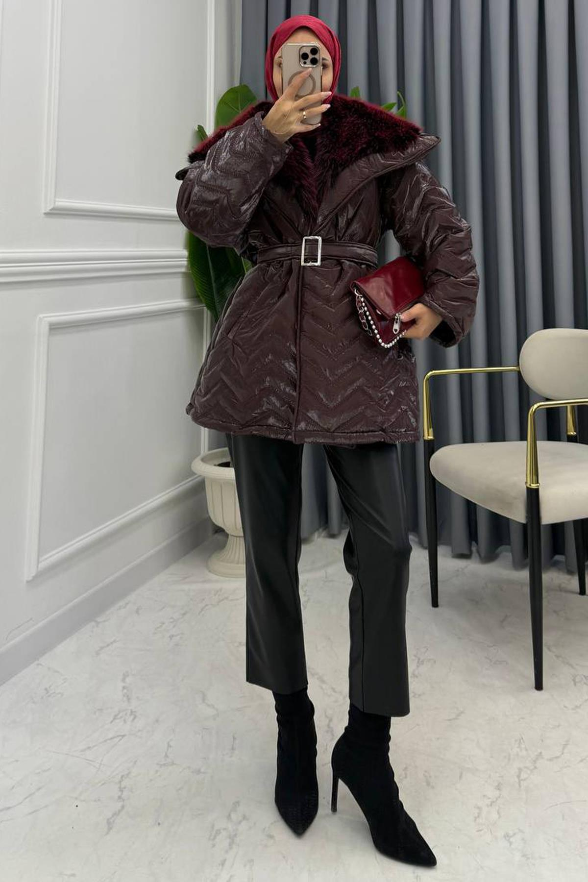 Kürk yaka detaylı, çift cepli, içi astarlı, seyyar kuşaklıdır.
