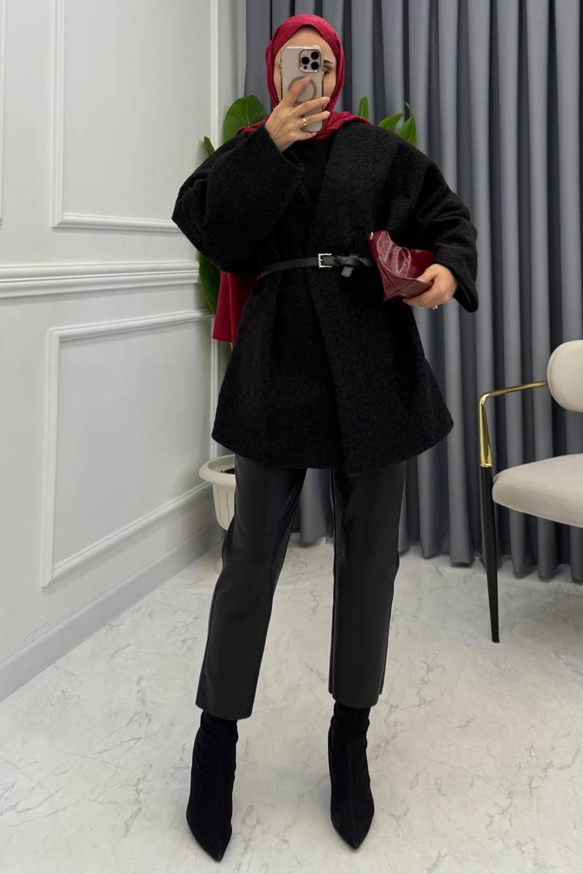 KIRÇILLI DERİ KEMER DETAY ASTARLI CEKET SİYAH