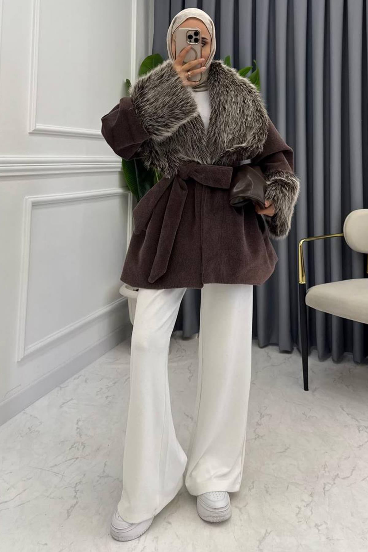 Kol ve yakası kürk detaylı, kullanılabilir çift cepli, içi astarlı, seyyar kuşaklıdır.