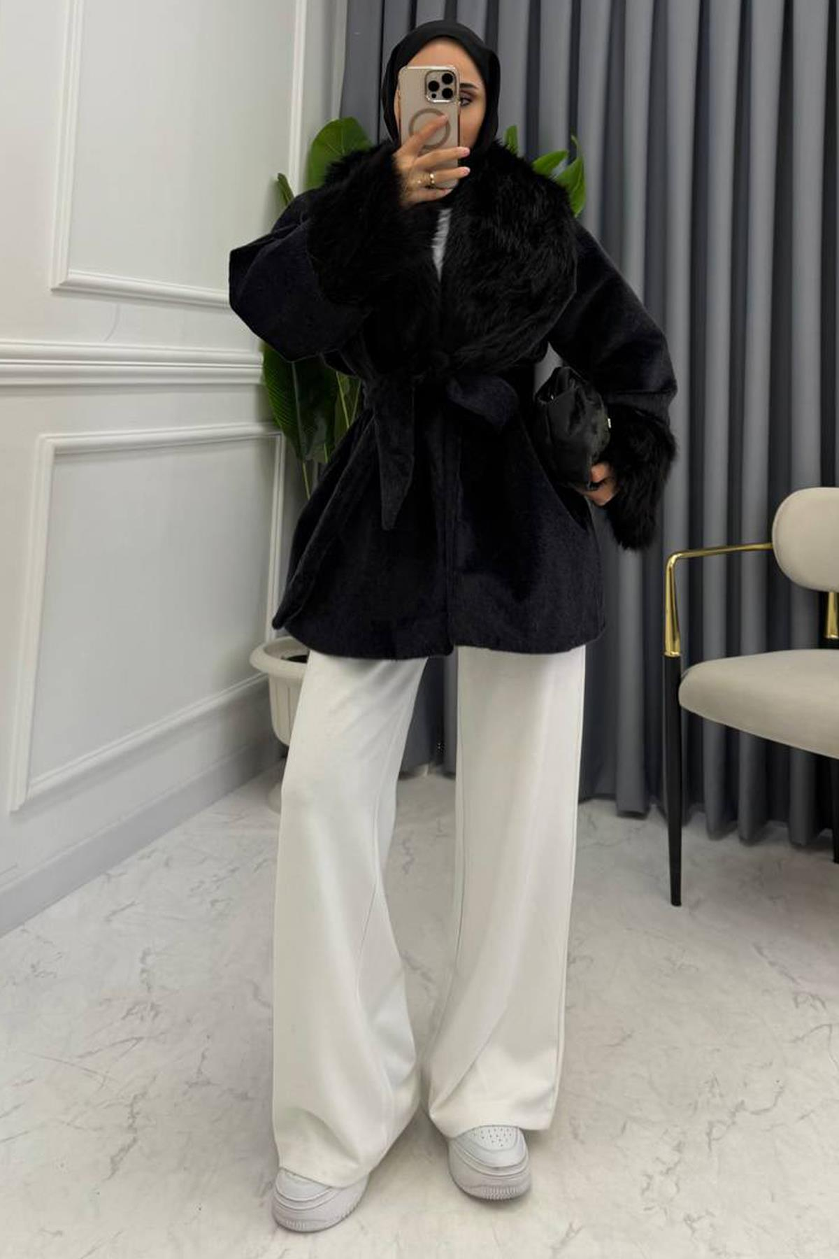 Kol ve yakası kürk detaylı, kullanılabilir çift cepli, içi astarlı, seyyar kuşaklıdır.