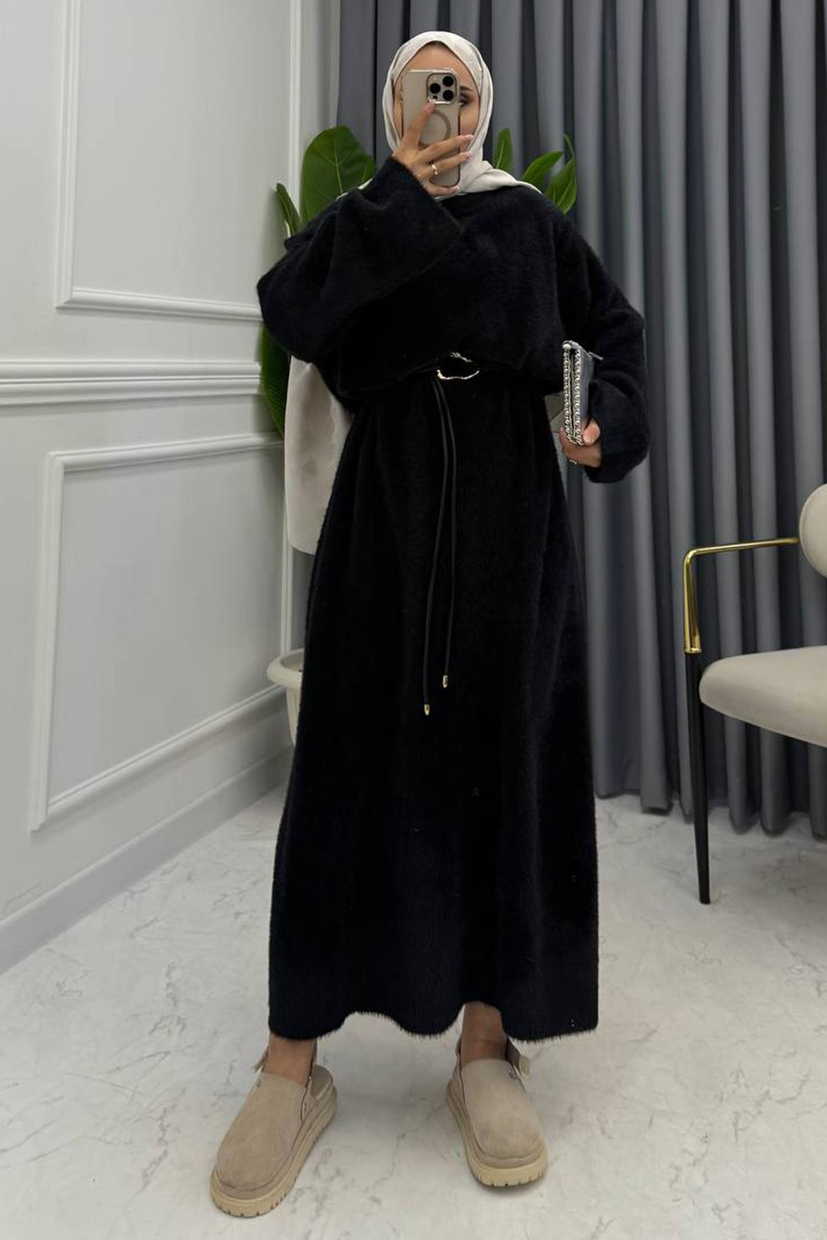 Triko kumaştır, kemer dahil değildir.