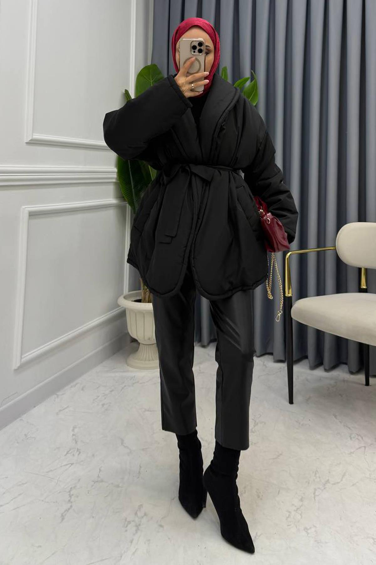 YAKALI ŞİŞME KEMERLİ MONT SİYAH (203454)